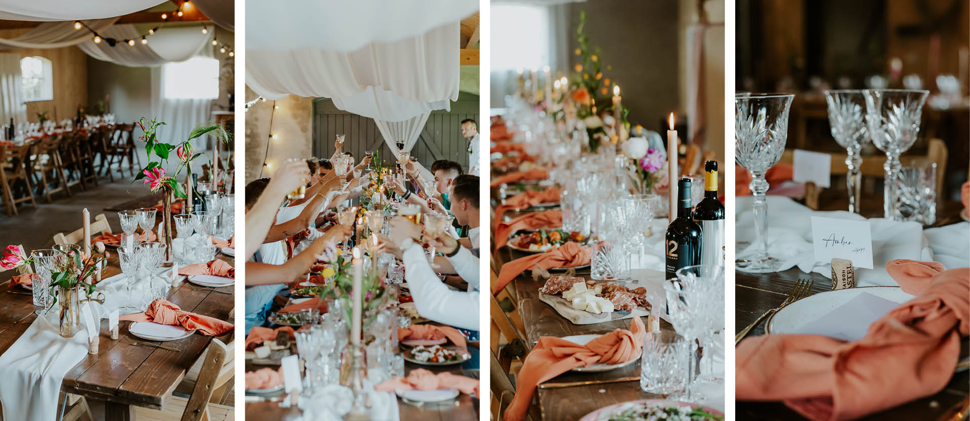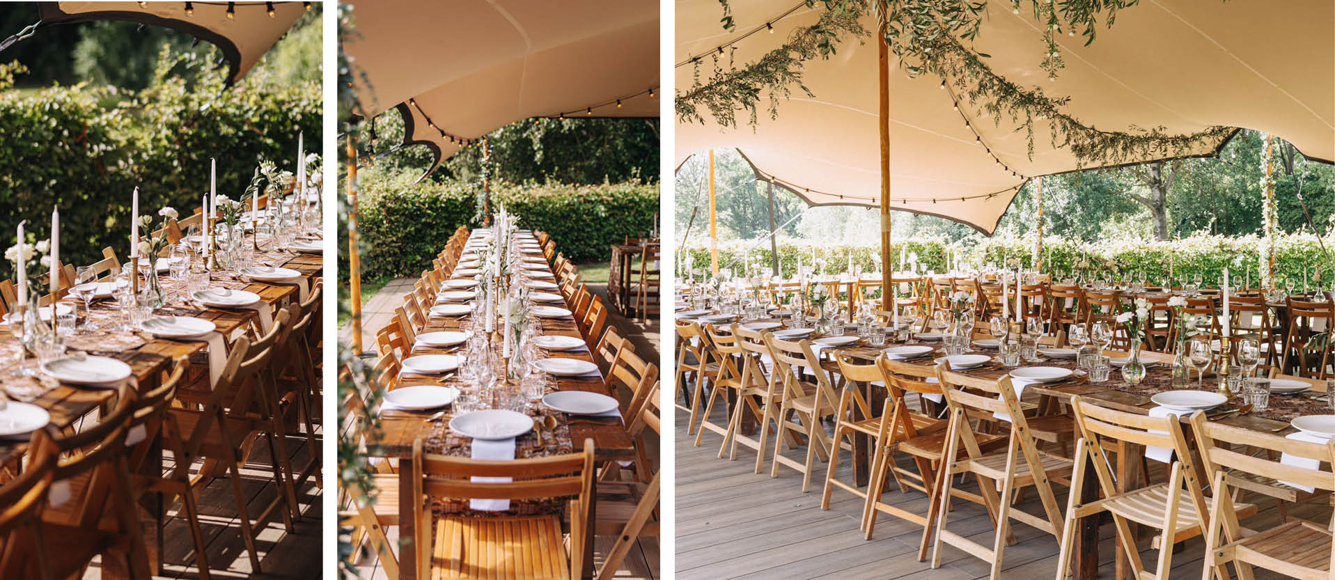 Voor deze warme en intieme bruiloft kozen we als basis onze houten dinertafels. Door deze puur te laten en niet te werken met tafellinnen, komt de natuurlijke, warme uitstraling direct naar voren. In combinatie met onze donkerhouten klapstoelen was de basis compleet. Extra warmte brachten we aan met een terracotta loper van chiffon. Deze luchtige stof laat de tafel subtiel zichtbaar en zorgt voor een zachte, elegante look. We combineerden dit met linnen servetten die perfect pasten binnen het natuurlijke kleurenpalet. Dit linnen detail kwam ook terug bij de stoelen van het bruidspaar, die we een speelse touch gaven met linten — een echte eyecatcher. Als finishing touch verzorgde Annette van GewoonUniekk prachtige bloemstukken: rustig van kleur, maar speels door de variatie aan bloemen.