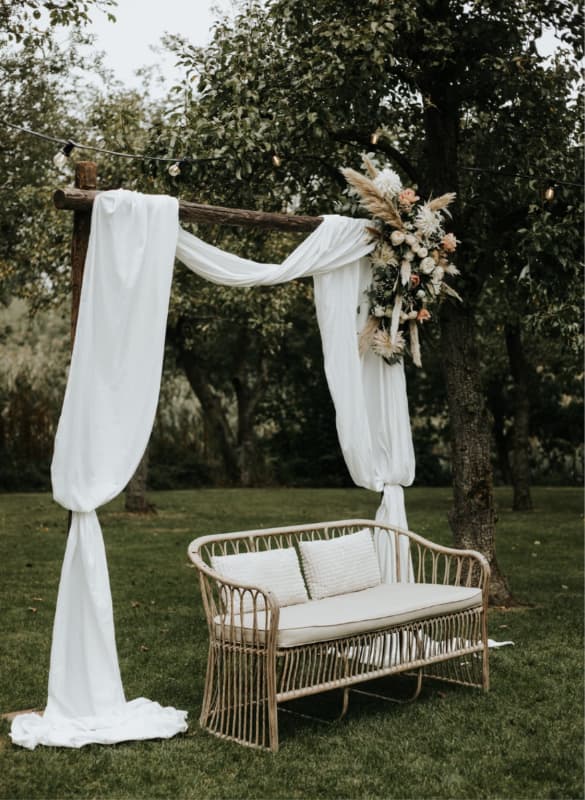 Daarnaast willen veel bruidsparen hun backdrop ook aankleden met een doek. Zo’n luchtig chiffon doek dat mooi door de boog valt lijkt misschien een klein detail, maar voor een ceremonieboog heb je vaak al snel zo’n acht meter stof nodig. En ook dat kan behoorlijk oplopen in de kosten.