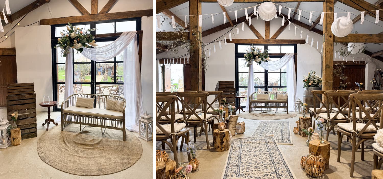 Voor de ceremonie kozen we voor onze crossback chairs, die meteen die landelijke, warme uitstraling geven. Op elke stoel lag een zacht kussentje, wat niet alleen comfortabel was, maar ook weer mooi aansloot bij het lichte kleurpalet van de dag. De ruimte voelde daardoor rustig, sfeervol en uitnodigend.