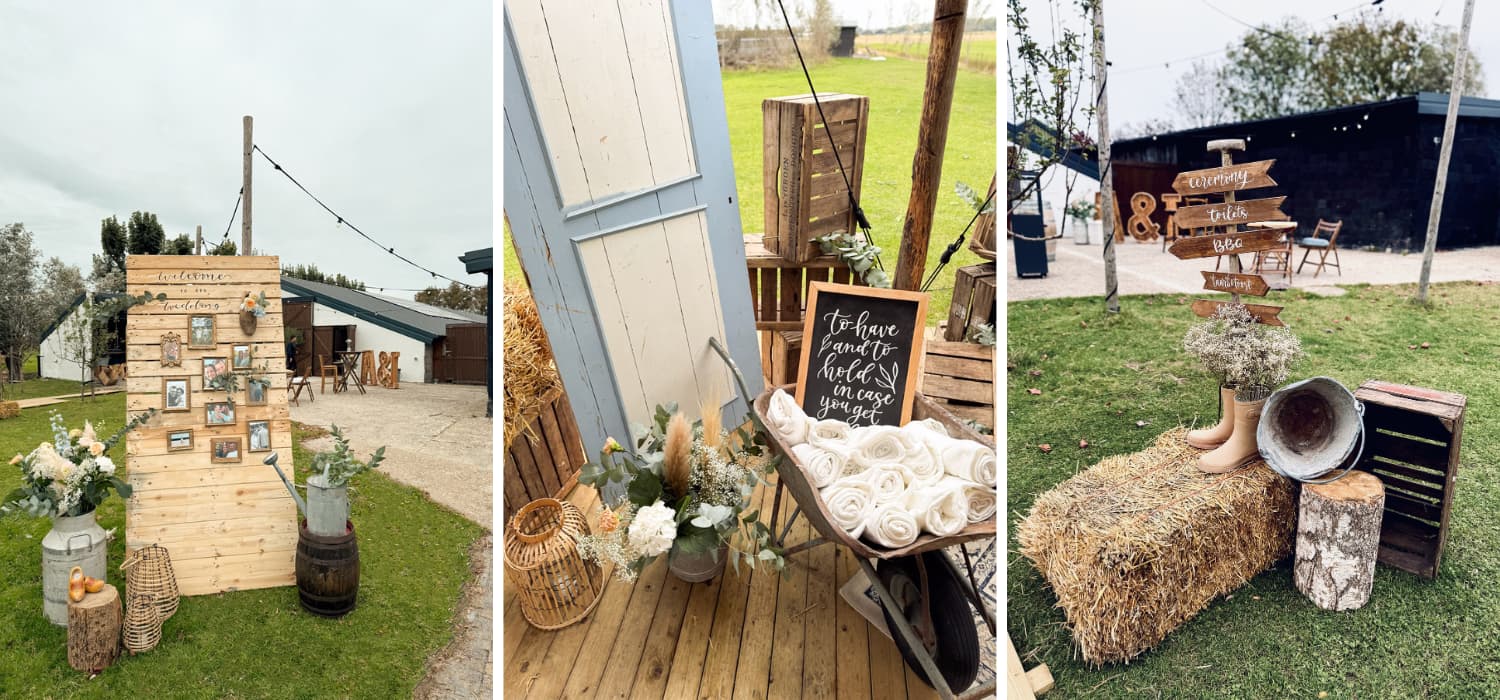 En verspreid over de styling voegden we nog meer subtiele landelijke elementen toe. Denk aan scheppen, harken, melkbussen met bloemwerk en zelfs laarzen gevuld met gipskruid. Juist dat soort details zorgden ervoor dat het thema voelbaar was, zonder dat het te letterlijk of te kitsch werd.