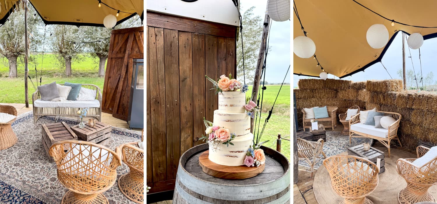 Na de ceremonie ontstond er vanzelf een gezellige borrelsfeer onder de stretchtent. We maakten verschillende hoekjes waar gasten konden zitten, kletsen en gewoon lekker genieten. Door de combinatie van hout, stro, zink en rotan voelde alles warm, landelijk en losjes aan.