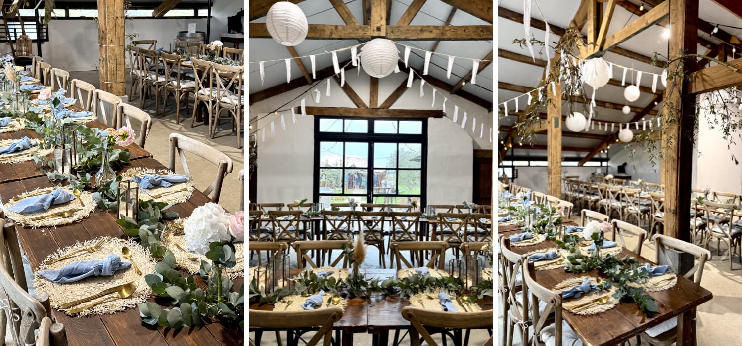 Ook voor de tafelstyling binnen in The White Barn trokken we die lijn helemaal door. We gebruikten opnieuw de crossback chairs, gecombineerd met onze rustieke klaptafels. Dit keer zonder tafelkleed, zodat het hout echt zichtbaar bleef en de tafels een rustieke basis vormden.