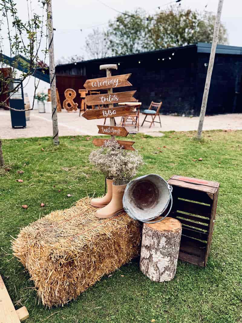Voor als het buiten toch wat frisser werd, stond er een kruiwagen klaar gevuld met plaidjes. Zo’n detail is niet alleen praktisch, maar voegt ook meteen weer iets toe aan het totaalplaatje. En vanwege de wind hadden we in de tent wat extra beschutting nodig. Die maakten we heel eenvoudig door een muurtje te bouwen van strobalen uit onze schuur. Praktisch, sfeervol en helemaal passend bij de barn uitstraling. Zo konden de gasten lekker borrelen zonder de wind steeds in hun nek te voelen.