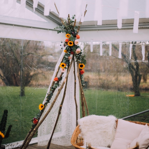 Tip! Decoreer de tipi met een mooi bloemstuk, of met een groene bos olijf of eucalyptus van Brisked! Deze optie kun je in jouw winkelmandje aanvinken.