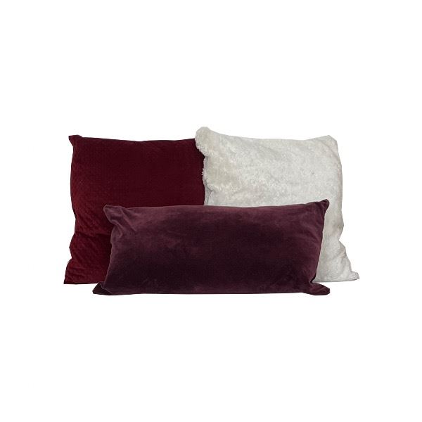 Deze kussenset bestaat uit de volgende kussentjes:kussen velvet bordeaux, kussen rechthoekig velvet burgundy, kussen fluffy wit.